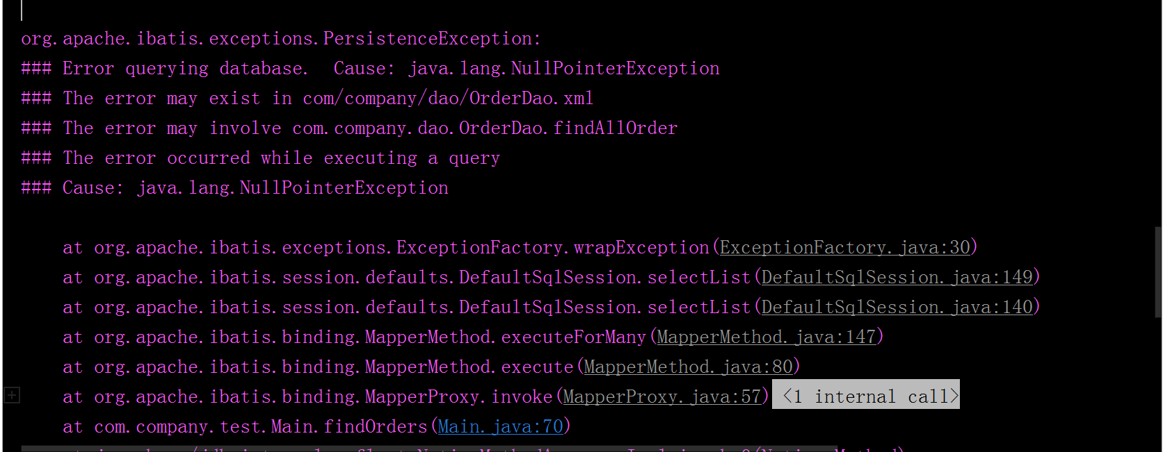 第一次使用 MyBatis 的动态代理方式生成Mapper接口实现类的时候,在自己封装数据源 DataSource 的时候踩坑了,config配置文件和dao配置文件都配置正确,但就是在调用dao类接口 进行sql查询的时候(例如 dao.findAll()),报空指针异常。如下图: