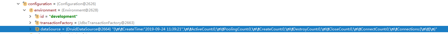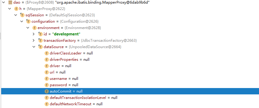 可以看到,configuration 对象里面,在 environment 对象中,dataSource 对象中的各种属性都是 null,数据库 url ,用户名、密码等等都是 null,这就说明 dataSource没有初始化,这是怎么回事呢?查询各种资料后,才发现自己把 UnpooledDataSourceFactory 类中的 dataSource 对象和自己封装的 dataSource 对象搞混了。看下面的错诶代码: